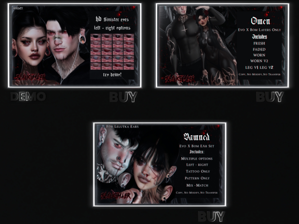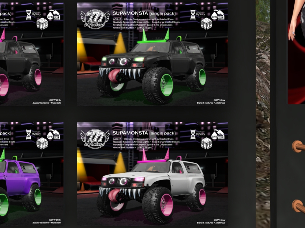 Featuring: Accessories, Animations/Poses/Props, Avatar Components, Avatar Enhancements, Builds, Clothing, Footwear, Home and Garden, Tattoos, Textures, Vehicles