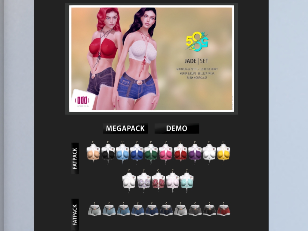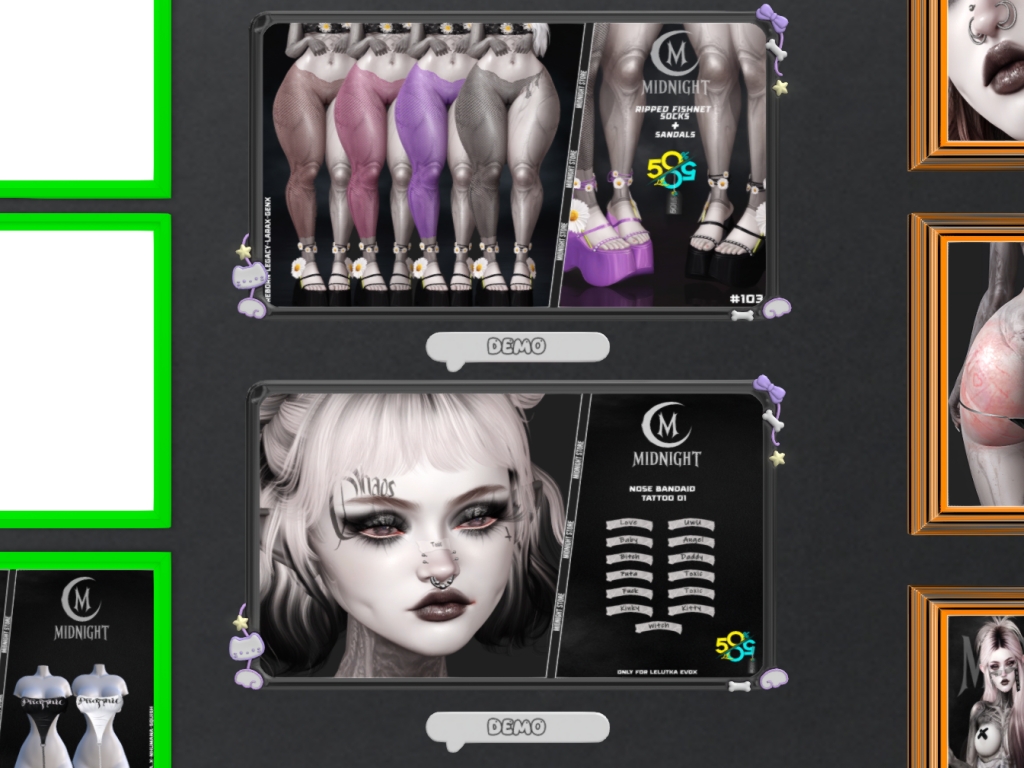 Featuring: Accessories, Animations/Poses/Props, Avatar Components, Avatar Enhancements, Builds, Clothing, Cosmetics/Nails, Footwear, Hairs, Home and Garden, Tattoos, Textures