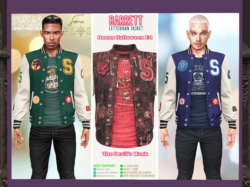 - Male Clothing – Lapointe & Bastchild Swear – The incredibly detailed Barrett Letterman Jacket rigged for Belleza Jake, Legacy Male/Athletic & Signature Gianni. 17+ style options with shirt/patches on/off. Arms/Trim/Chest are color change via HUD. Bonus Halloween edition included.