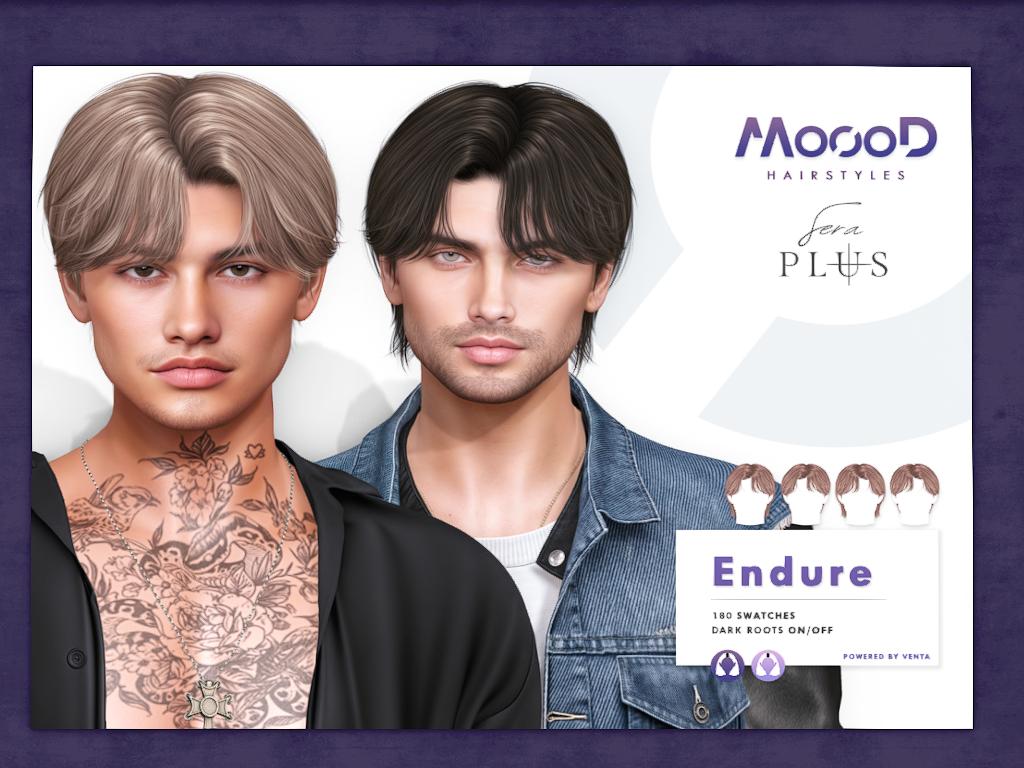- Male Hair – MoooD- A full fatpack of a fabulous new hair from MoooD called Endure. Includes a HUD with 180 color tints. Dark roots on/off via HUD also included.
