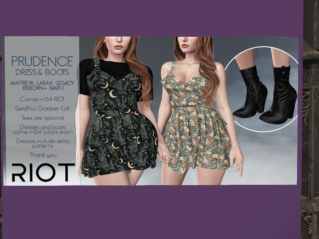 - Female Clothing & Footwear – RIOT – A full Megapack called Prudence including dress and boots rigged for Maitreya, Lara X, Legacy, Reborn and Waifu. 54 RIOT Solid Color tones included for dress and boots as well as extra dress pattern options. Tees are optional. Minipack of BOM panties also included.