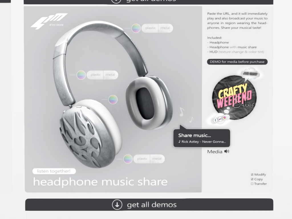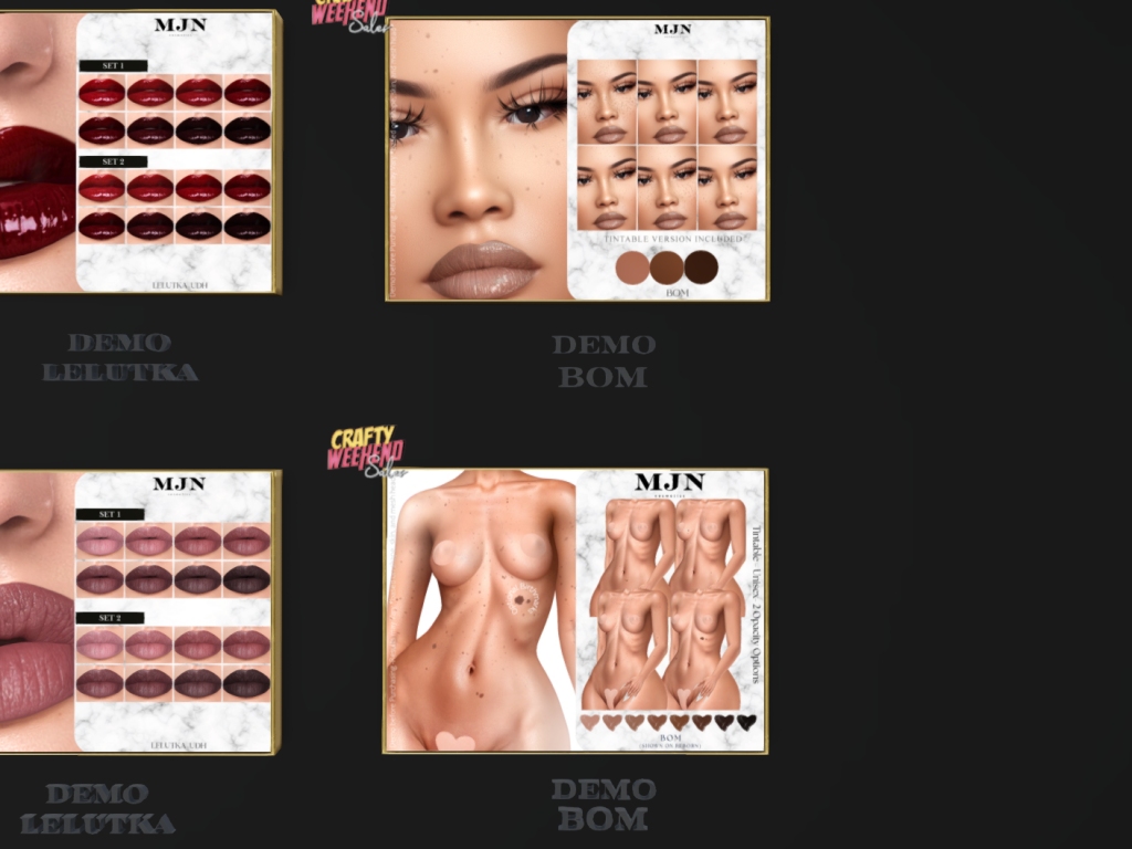 Featuring: Accessories, Animations/Poses/Props, Avatar Components, Avatar Enhancements, Builds, Clothing, Cosmetics/Nails, Footwear, Hairs, Home and Garden, Skins, Tattoos, Vehicles