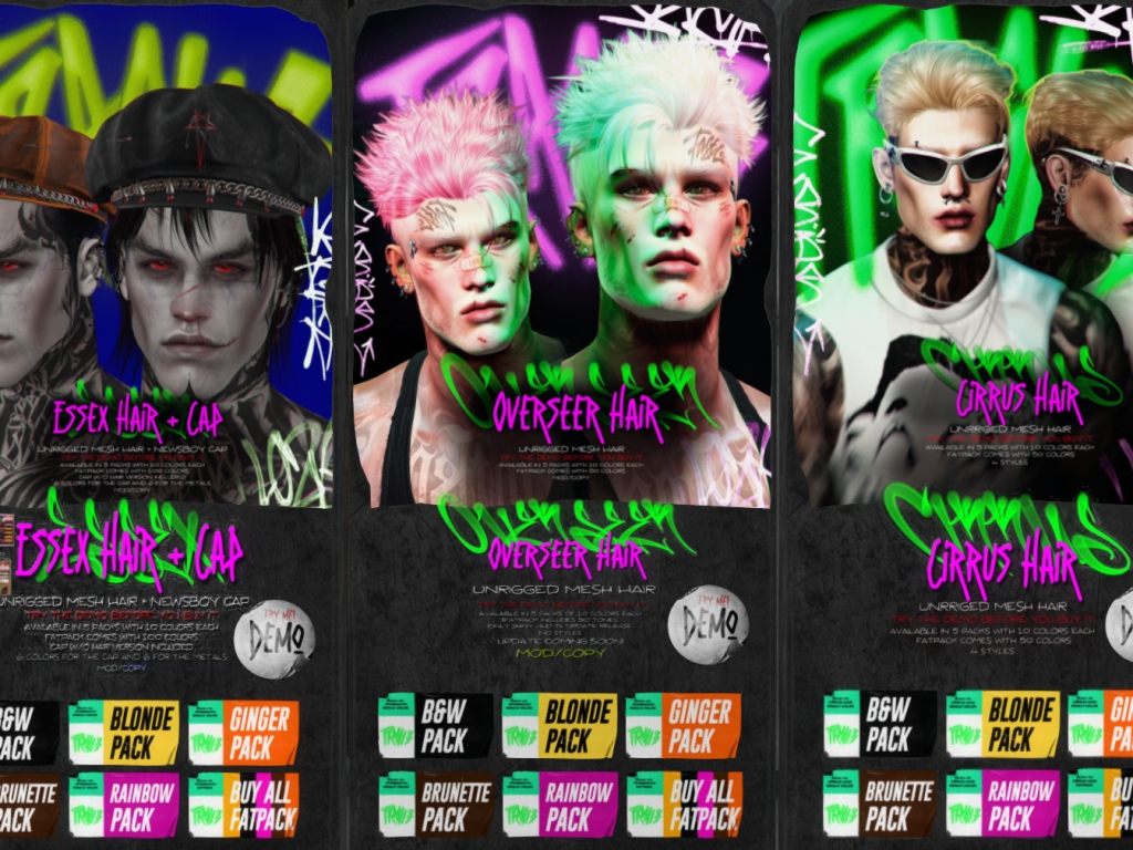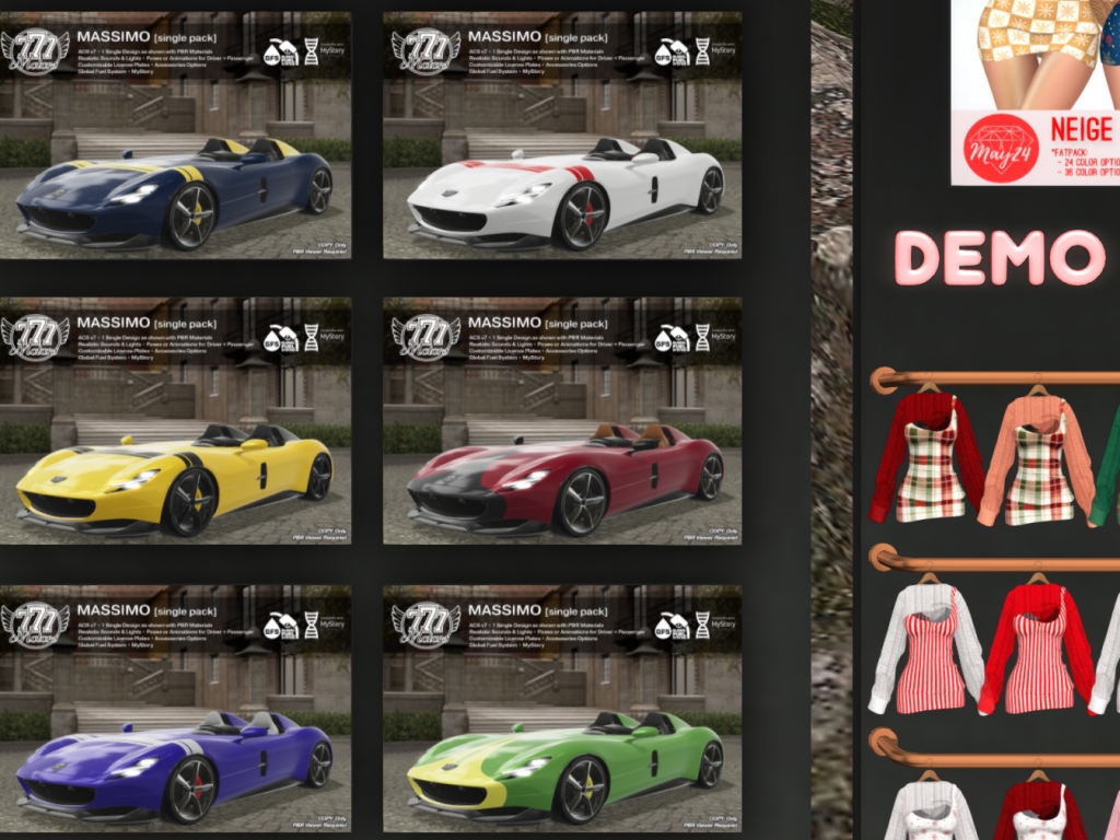 Featuring: Accessories, Animations/Poses/Props, Avatar Components, Avatar Enhancements, Builds, Clothing, Footwear, Hairs, Home and Garden, Shapes, Skins, Tattoos, Vehicles