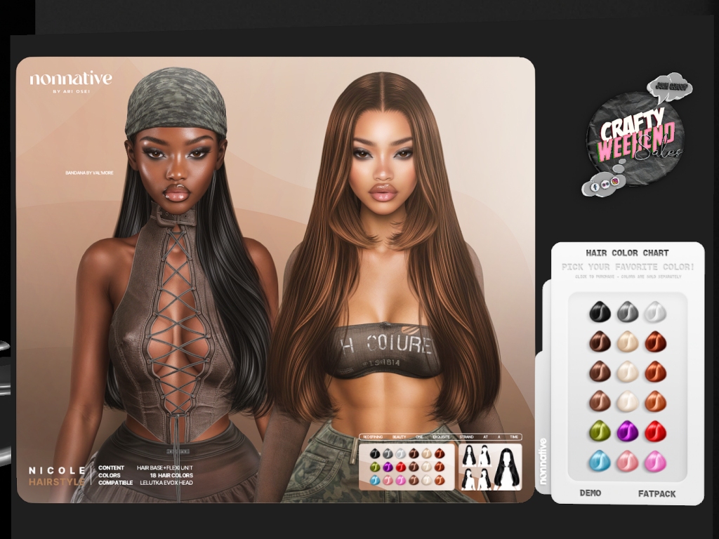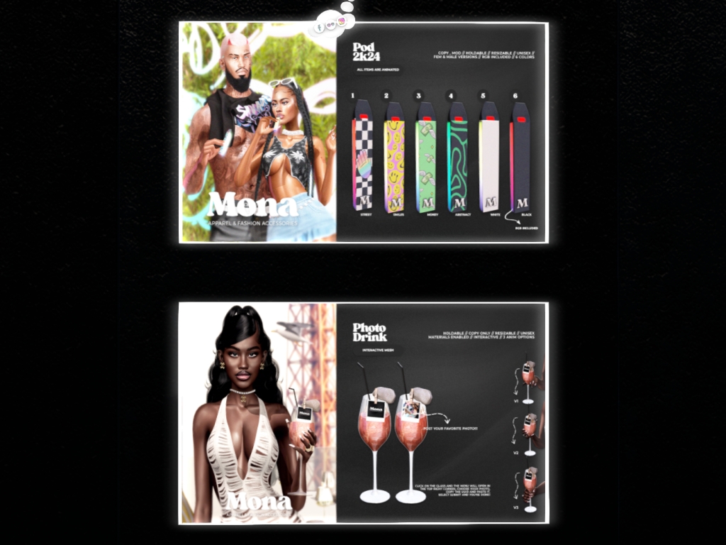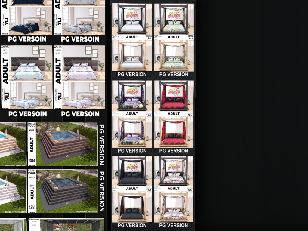 Featuring: Accessories, Animations/Poses/Props, Avatar Components, Avatar Enhancements, Builds, Clothing, Cosmetics/Nails, Footwear, Hairs, Home and Garden, Skins, Tattoos, Vehicles