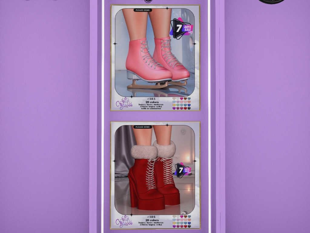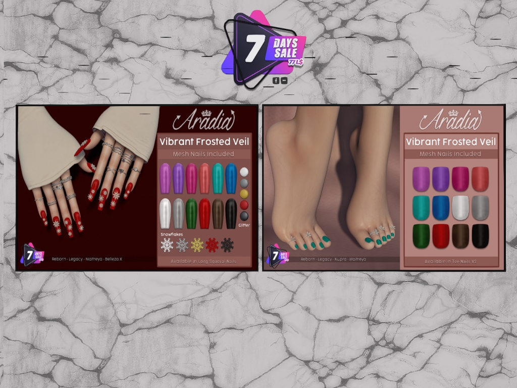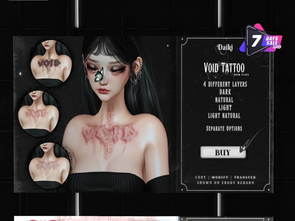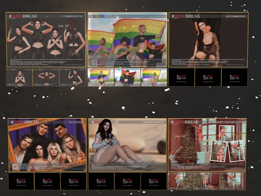 Featuring: Accessories, Animations/Poses/Props, Avatar Enhancements, Clothing, Cosmetics/Nails, Footwear, Shapes, Skins, Tattoos, Textures