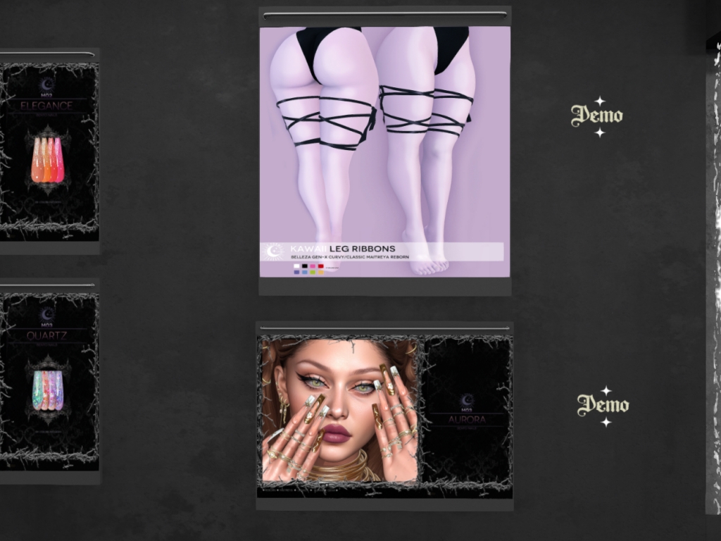 Featuring: Accessories, Animations/Poses/Props, Avatar Enhancements, Builds, Clothing, Cosmetics/Nails, Footwear, Home and Garden, Shapes, Skins, Tattoos,