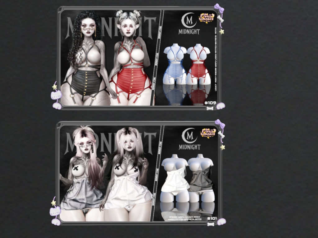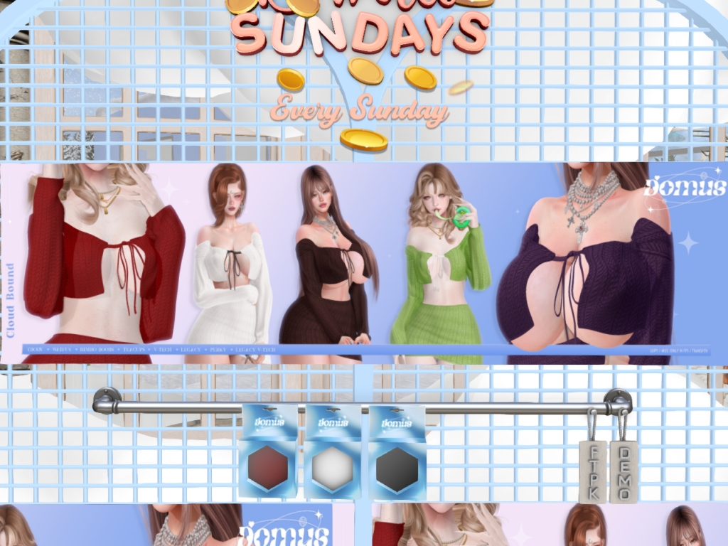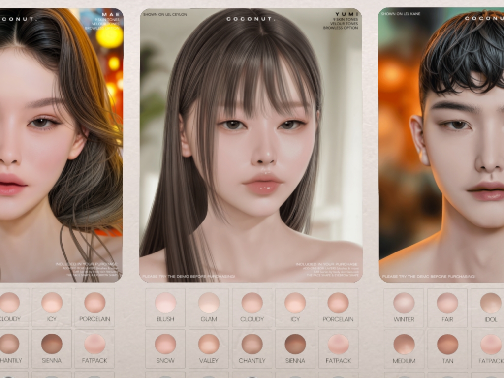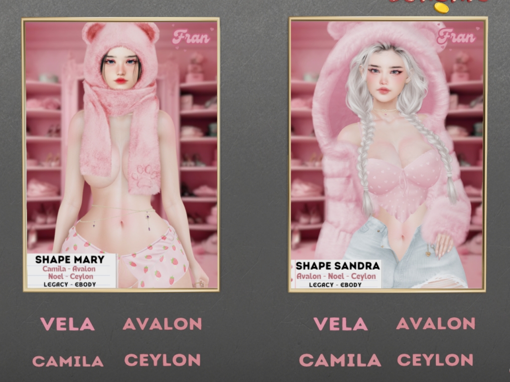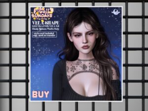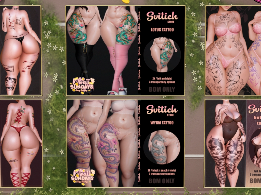 Featuring: Accessories, Animations/Poses/Props, Avatar Components, Avatar Enhancements, Builds, Clothing, Cosmetics/Nails, Footwear, Shapes, Skins, Tattoos