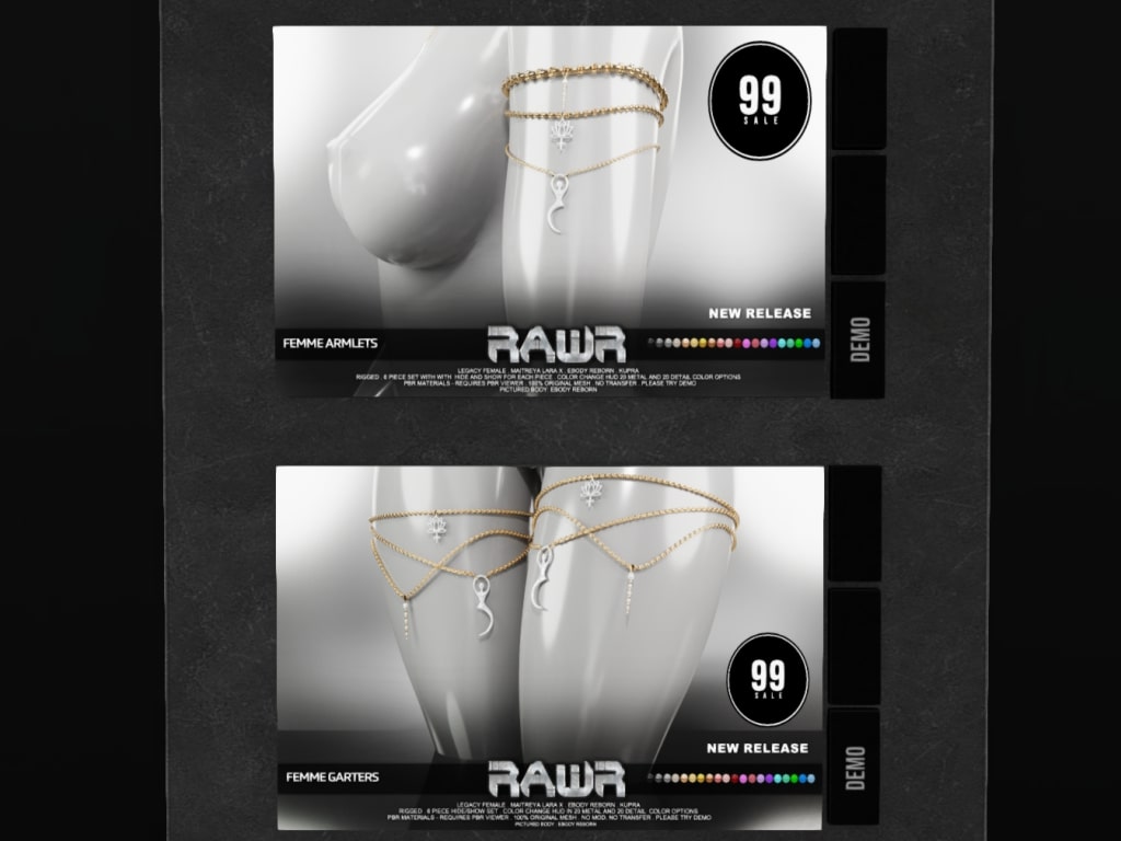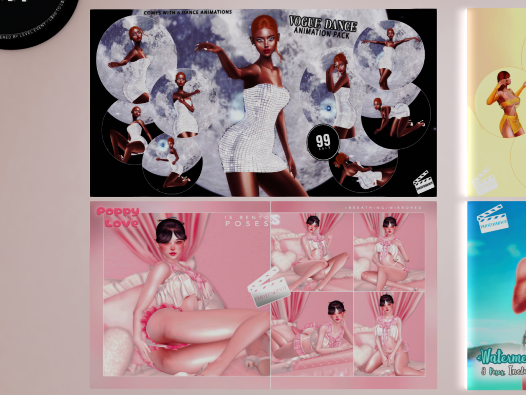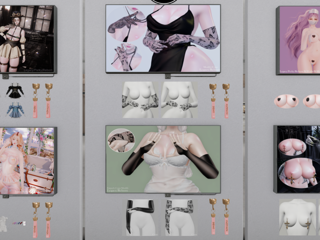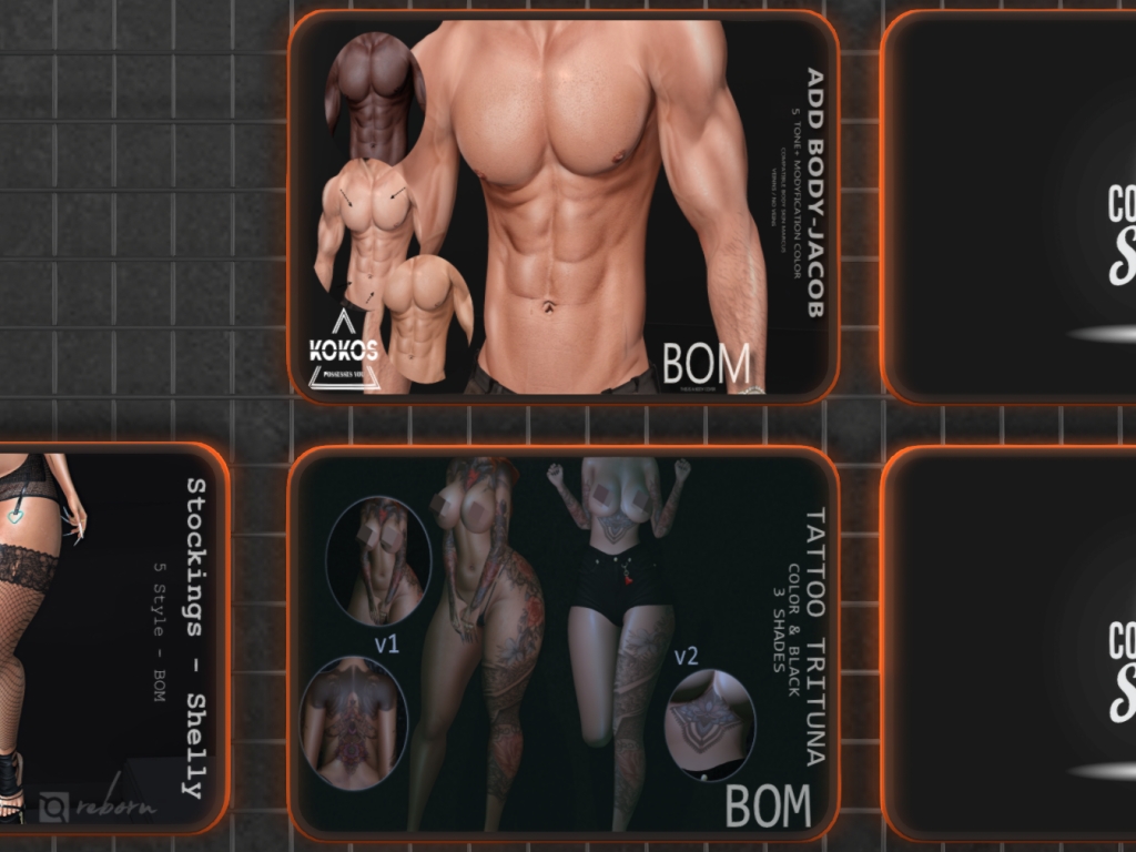 Featuring: Accessories, Animations/Poses/Props, Avatar Components, Avatar Enhancements, Clothing, Cosmetics/Nails, Footwear, Home and Garden, Skins, Tattoos, Vehicles