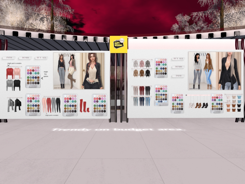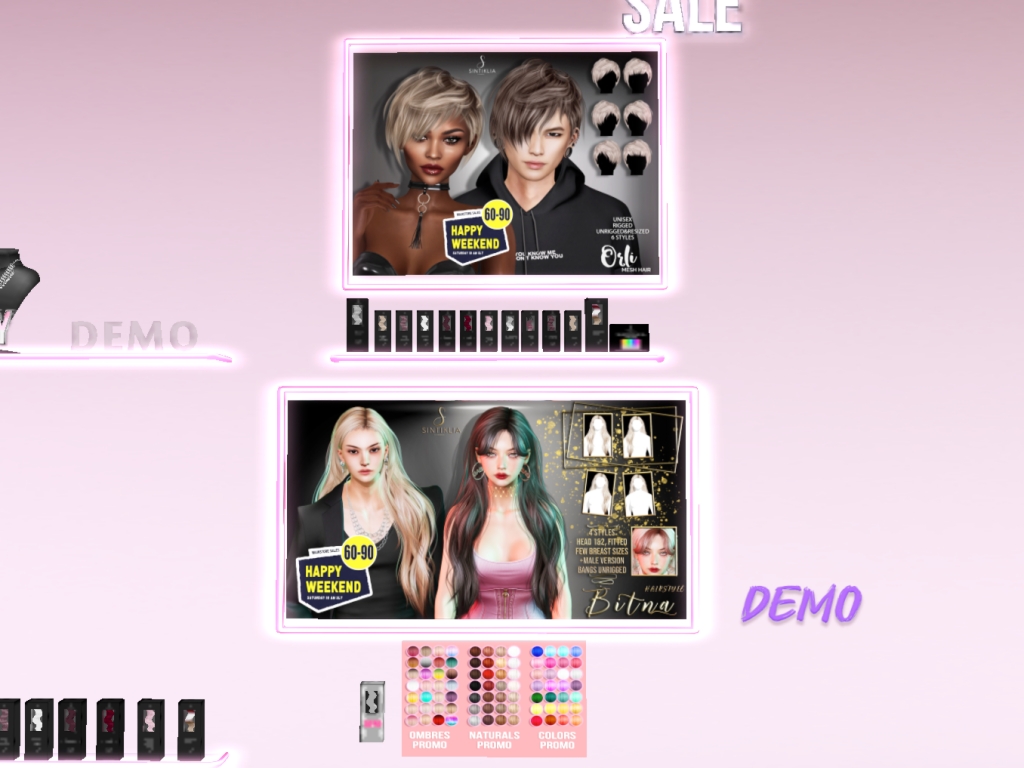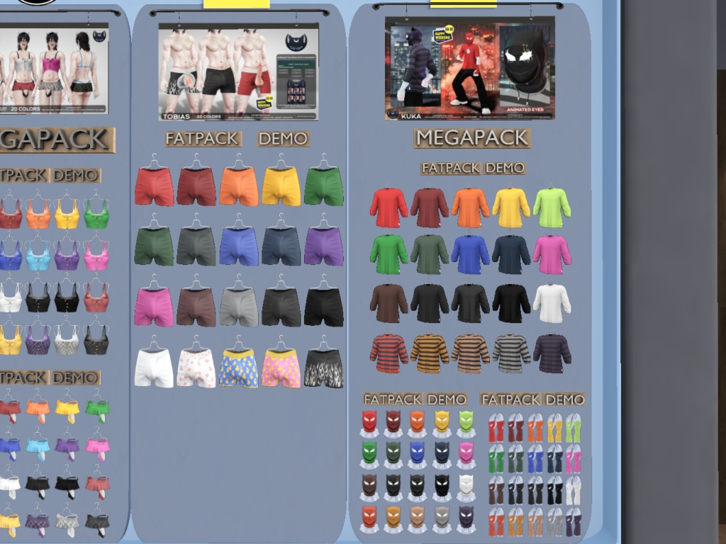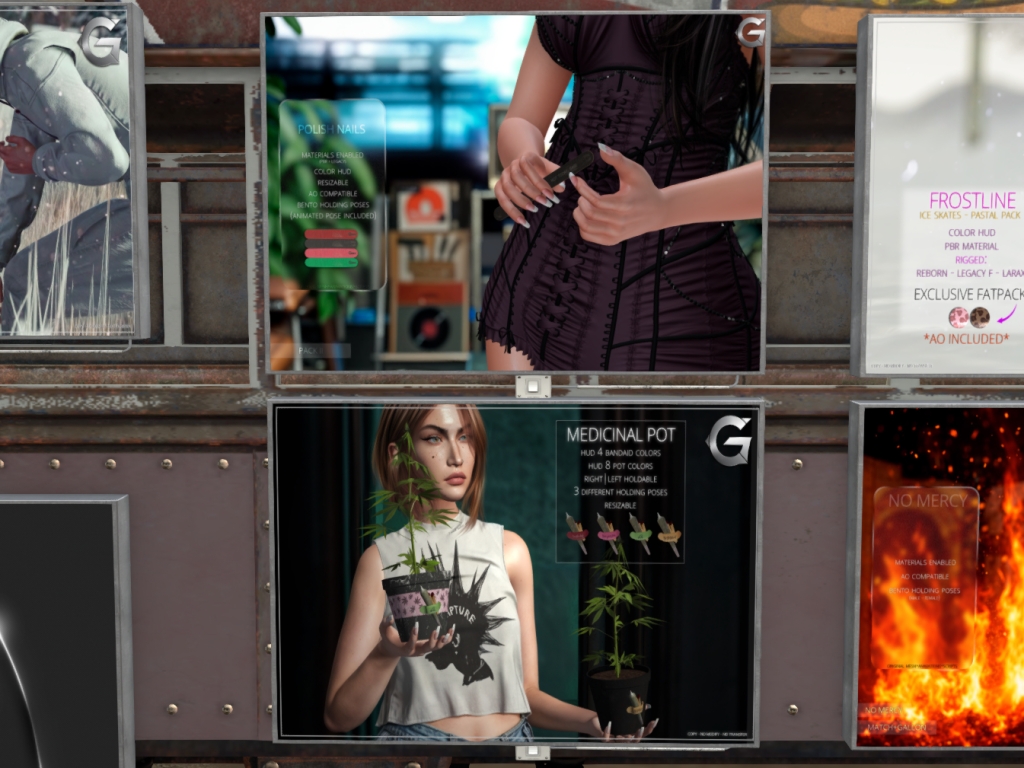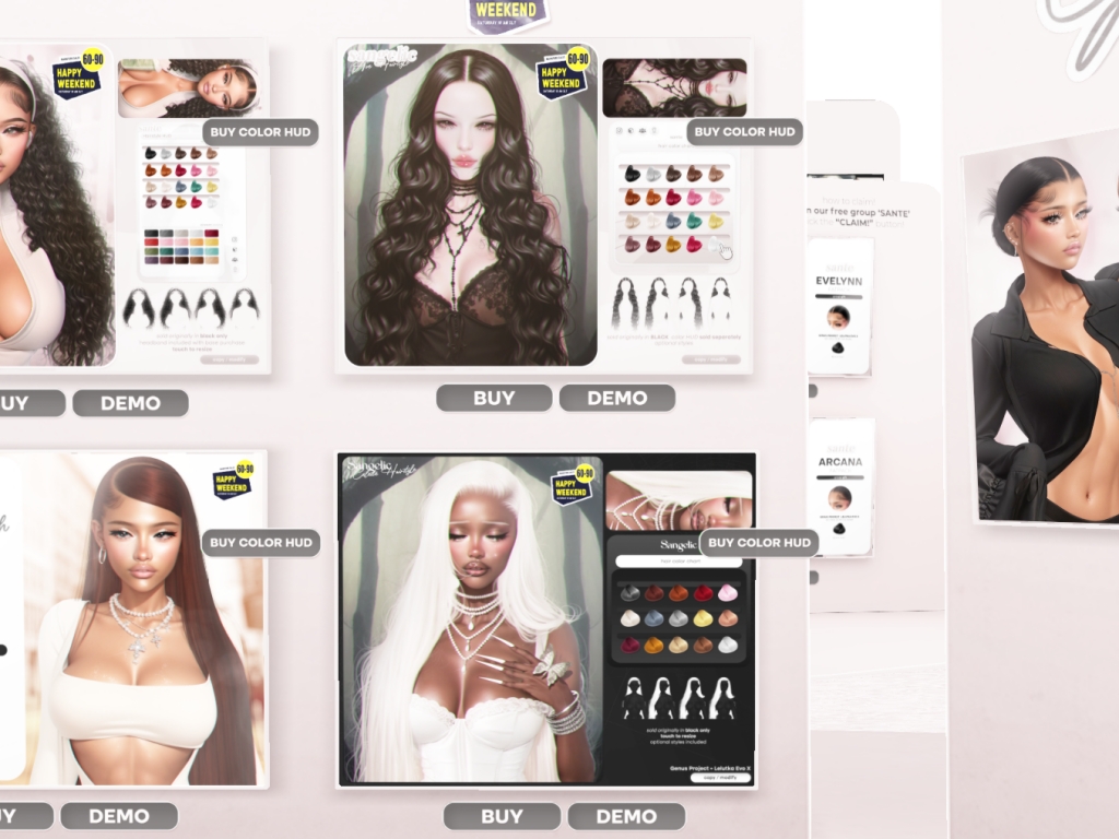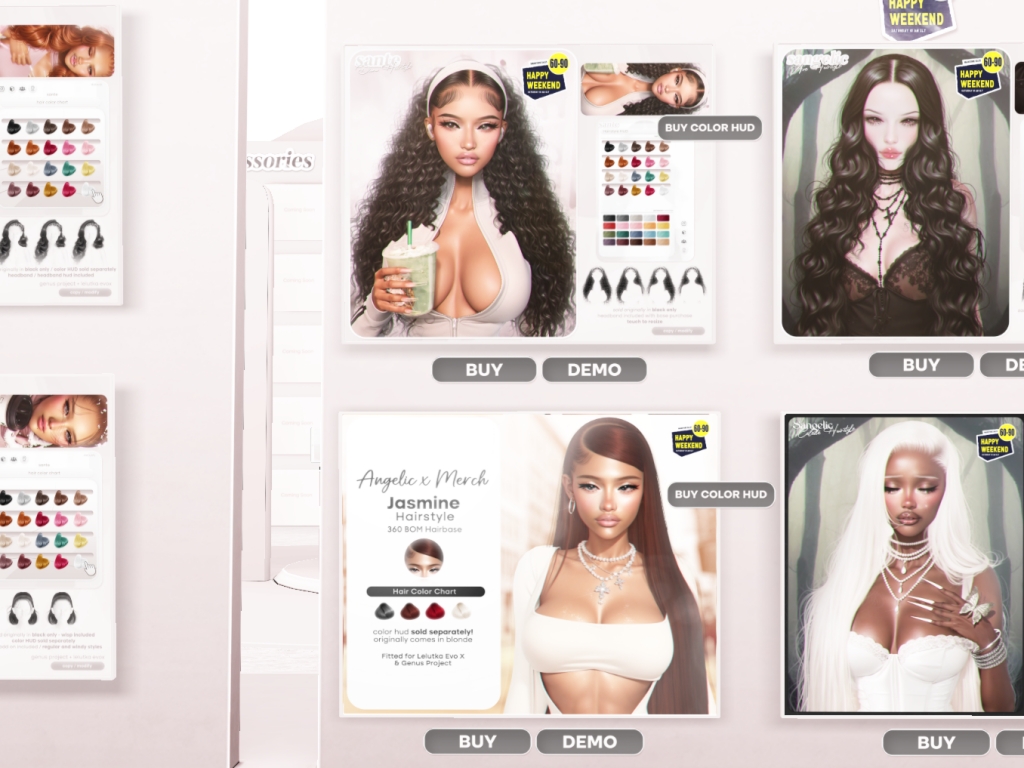 Featuring: Accessories, Animations/Poses/Props, Avatar Components, Avatar Enhancements, Builds, Clothing, Cosmetics/Nails, Footwear, Hairs, Home and Garden, HUDs, Interactive Games, Shapes, Skins, Tattoos, Vehicles