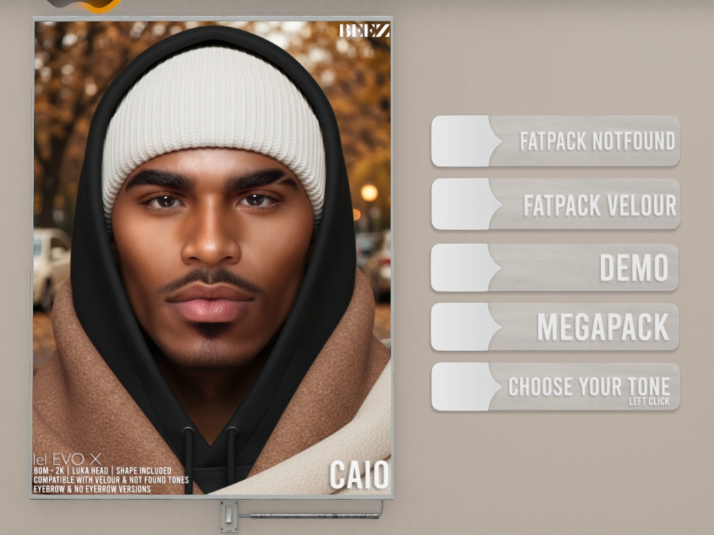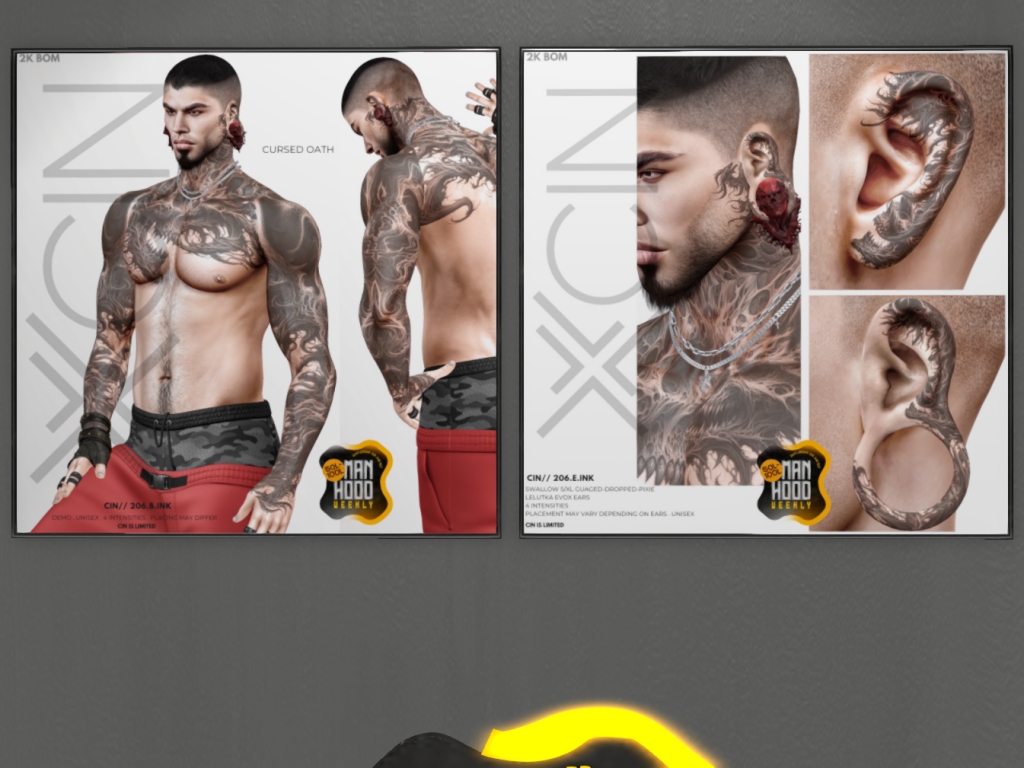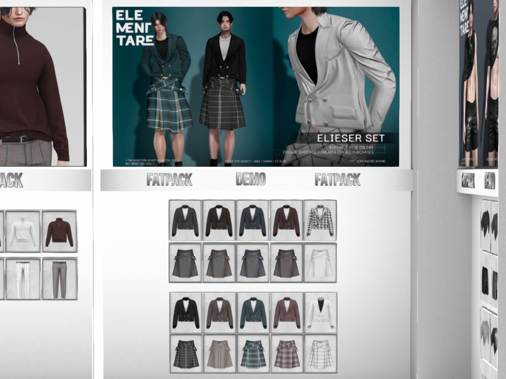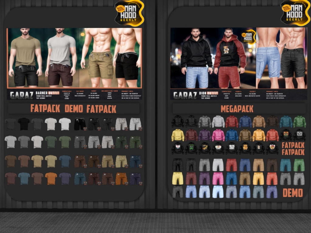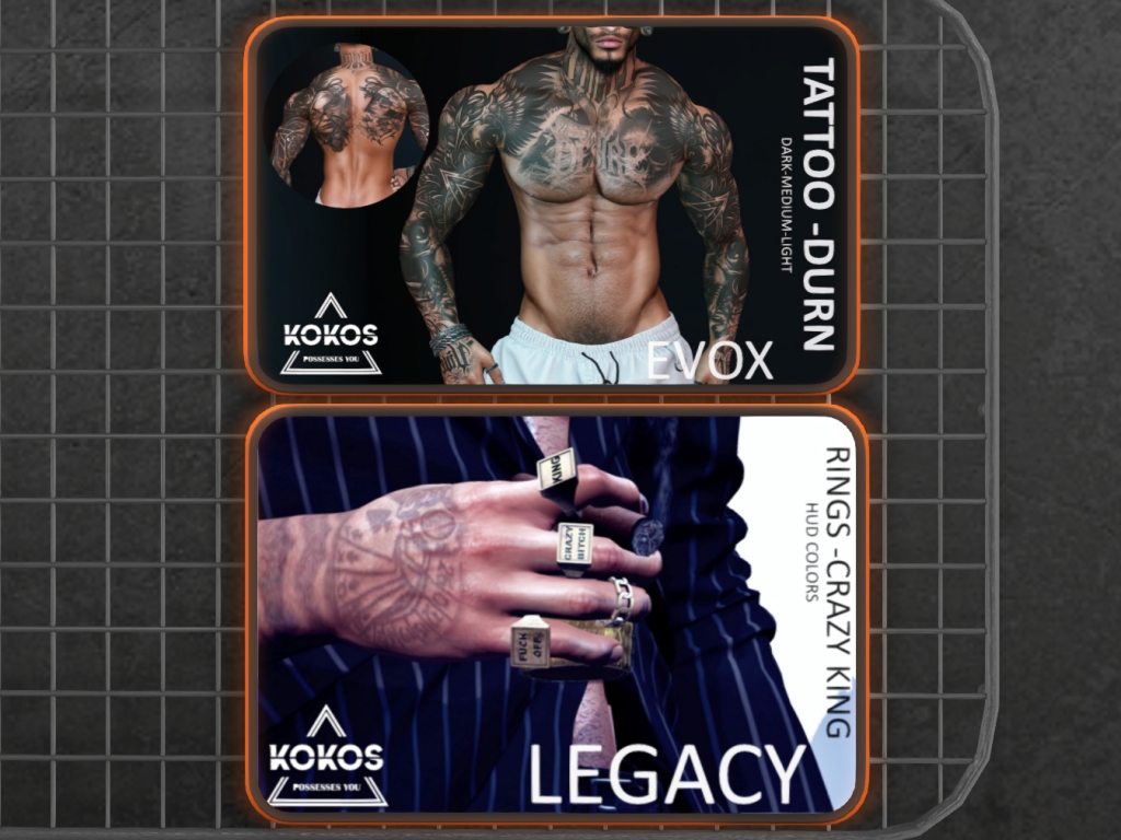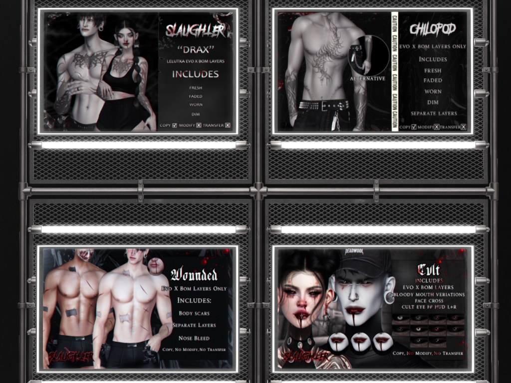 Featuring: Accessories, Animations/Poses/Props, Avatar Enhancements, Builds, Clothing, Footwear, Hairs, Shapes, Skins, Tattoos