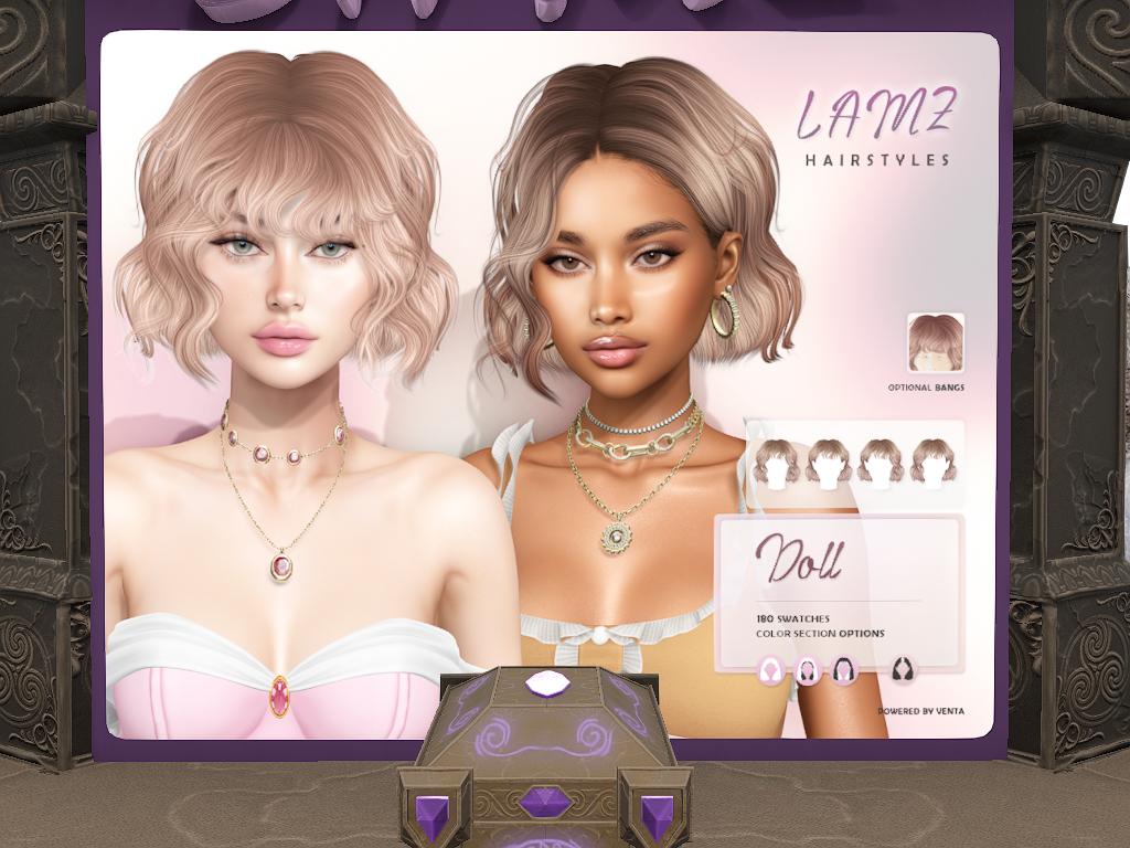 - Female Hair – LAMZ- A full fatpack of a fabulous new hair from LAMZ called Doll. Includes a HUD with 180 color swatches. Optional bangs included. Dark roots on/off via HUD as well as color everything/primary/secondary also included.