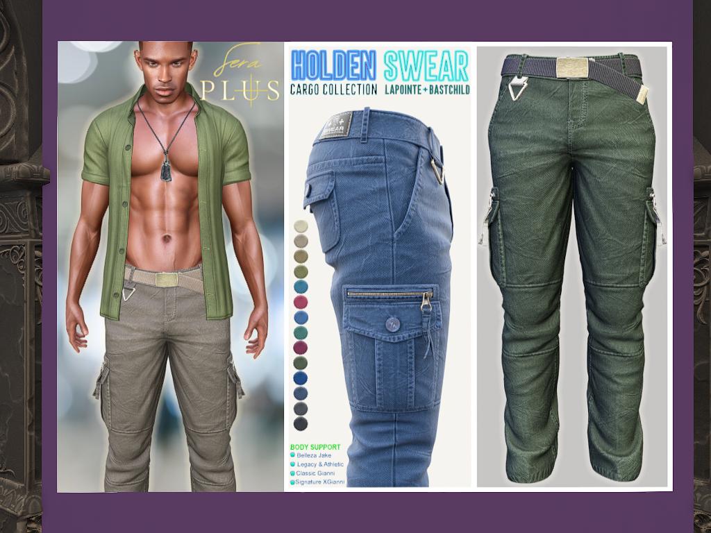 - Male Clothing – Lapointe & Bastchild Swear – The incredibly detailed Holden Cargo Collection rigged for Belleza Jake, Legacy Male/Athletic & Classic Gianni/Signature XGianni. 14 fabric colors included in the HUD.
