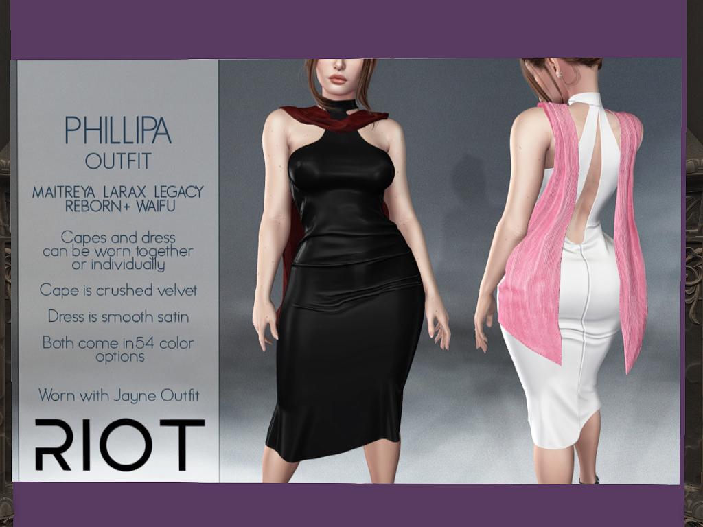 - Female Accessory & Clothing – Riot – A full Megapack called Phillipa including a smooth satin dress and crushed velvet cape rigged for Maitreya, Lara X, Legacy, Reborn and Waifu. 54 solid color tones included for dress and cape via HUD. Minipack of BOM panties and style card included as well.