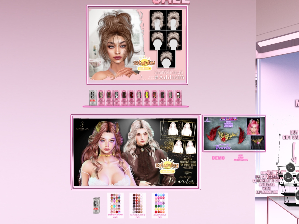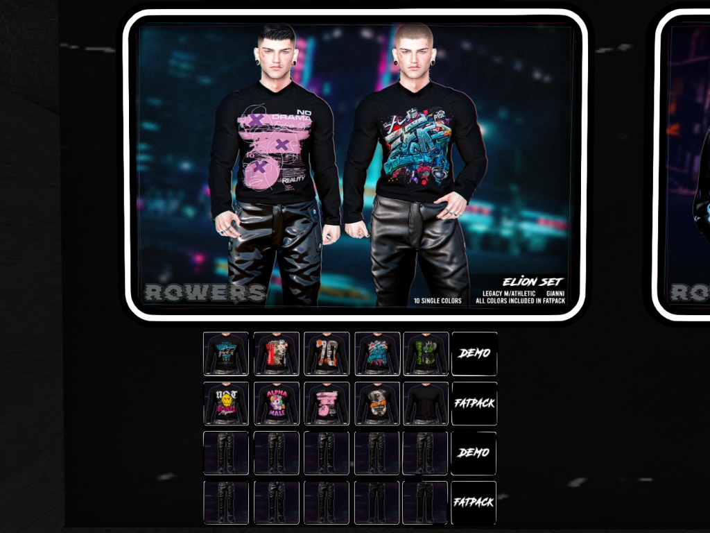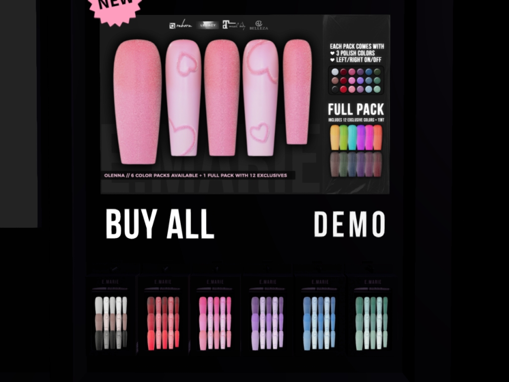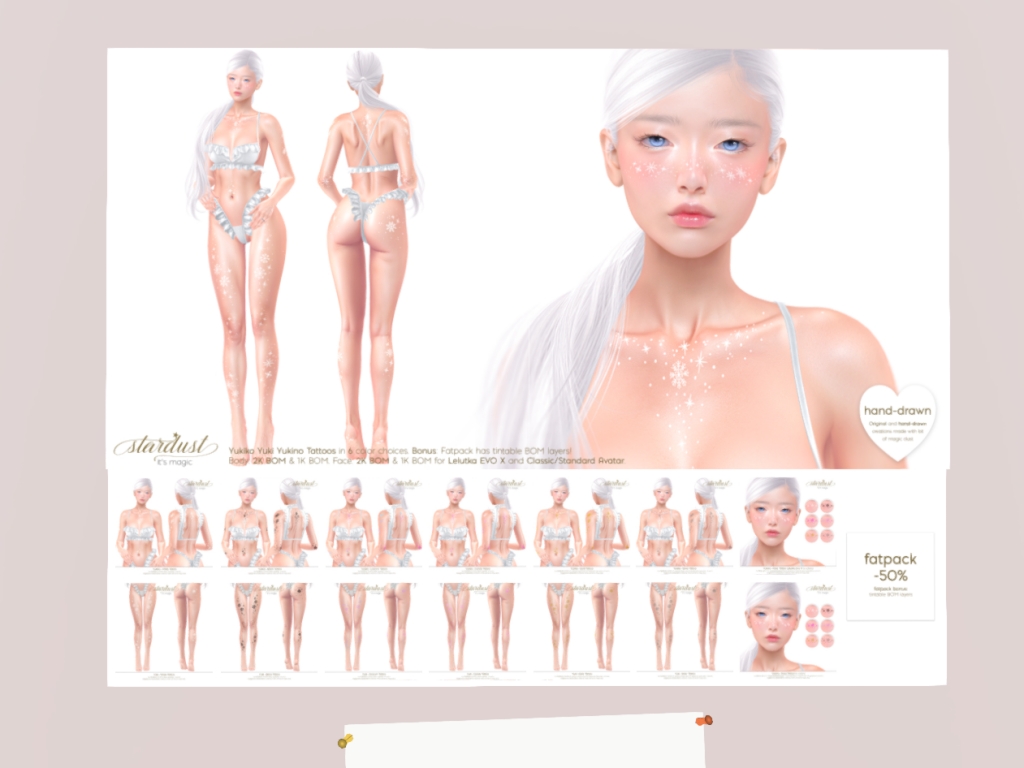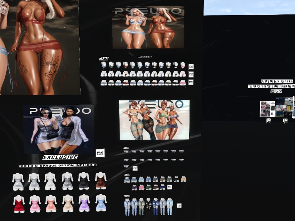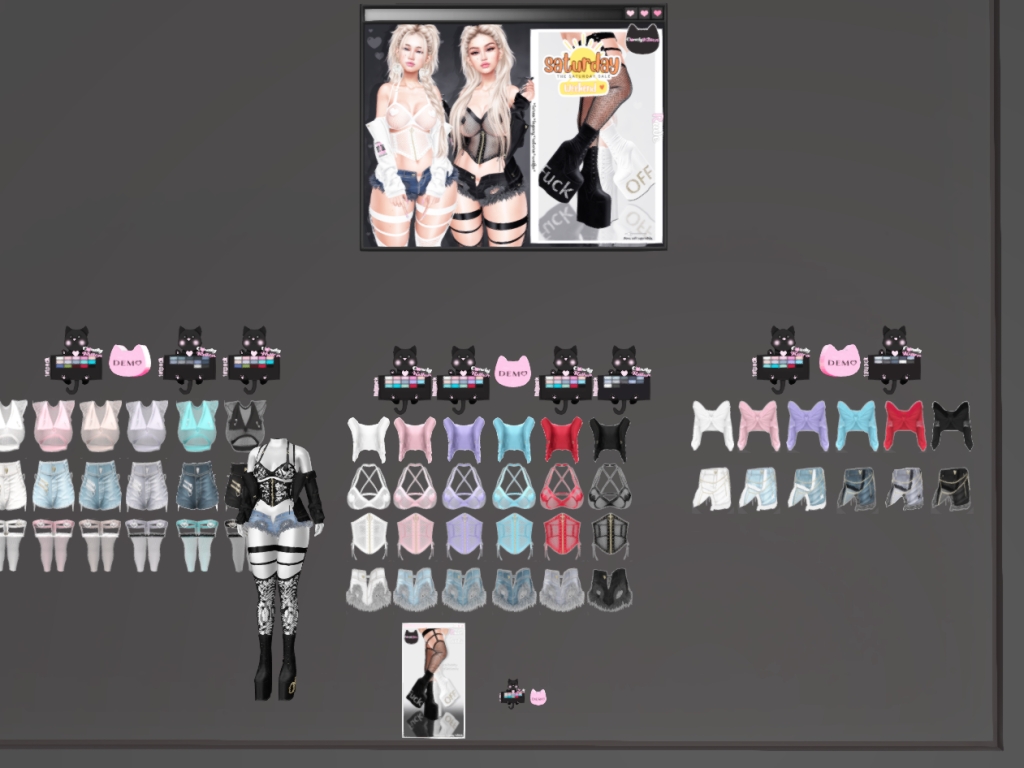 Featuring: Accessories, Animations/Poses/Props, Avatar Components, Avatar Enhancements, Builds, Clothing, Cosmetics/Nails, Hairs, Home and Garden, Skins, Tattoos, Vehicles