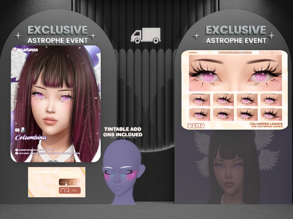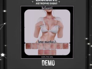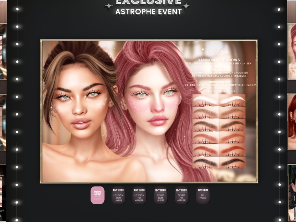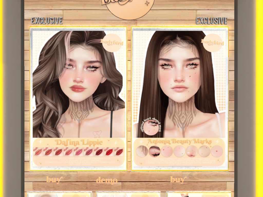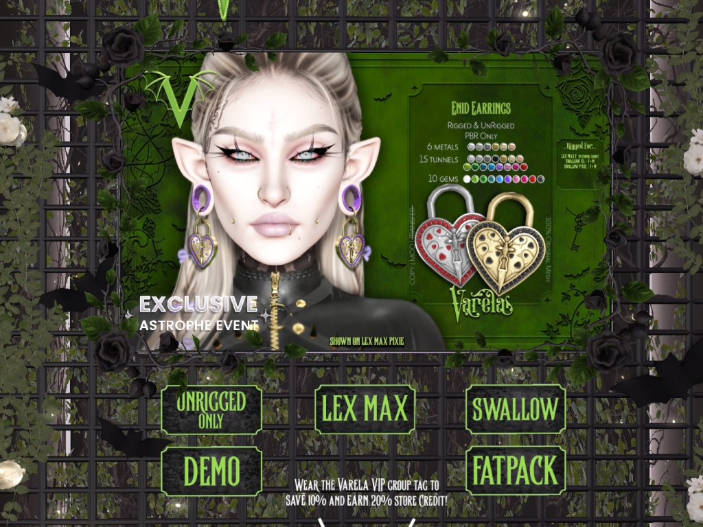Featuring: Accessories, Animals/Pets/Companions, Animations/Poses/Props, Avatar Components, Avatar Enhancements, Builds, Clothing, Cosmetics/Nails, Footwear, Home and Garden, Shapes, Skins, Tattoos