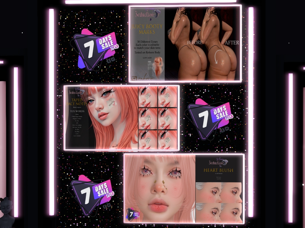 Featuring: Accessories, Animations/Poses/Props, Appliers/Cosmetics/Nails, Avatar Enhancements, Clothing, Footwear, Hairs, Home and Garden, Shapes, Textures