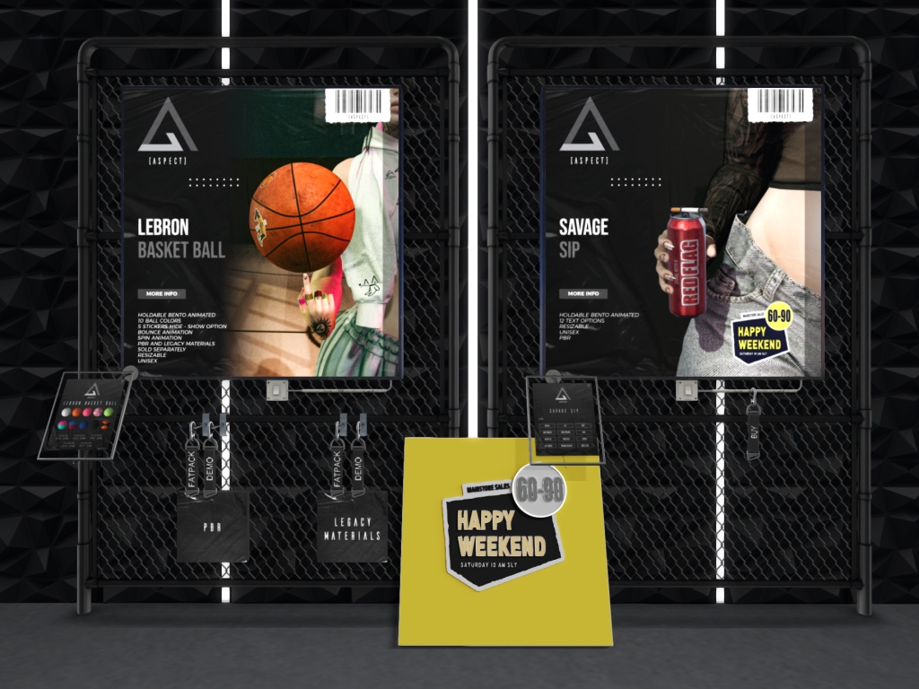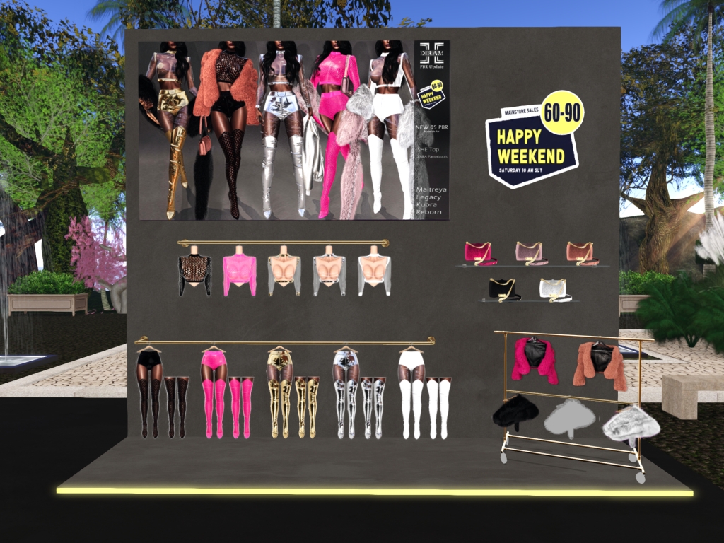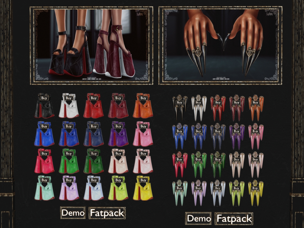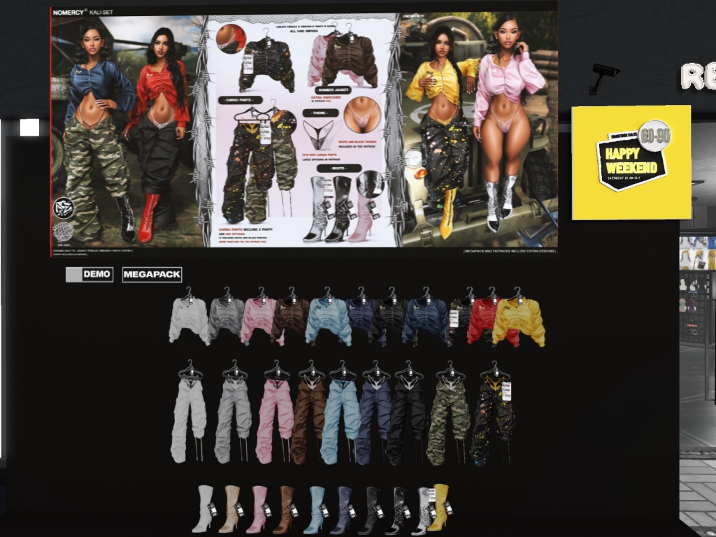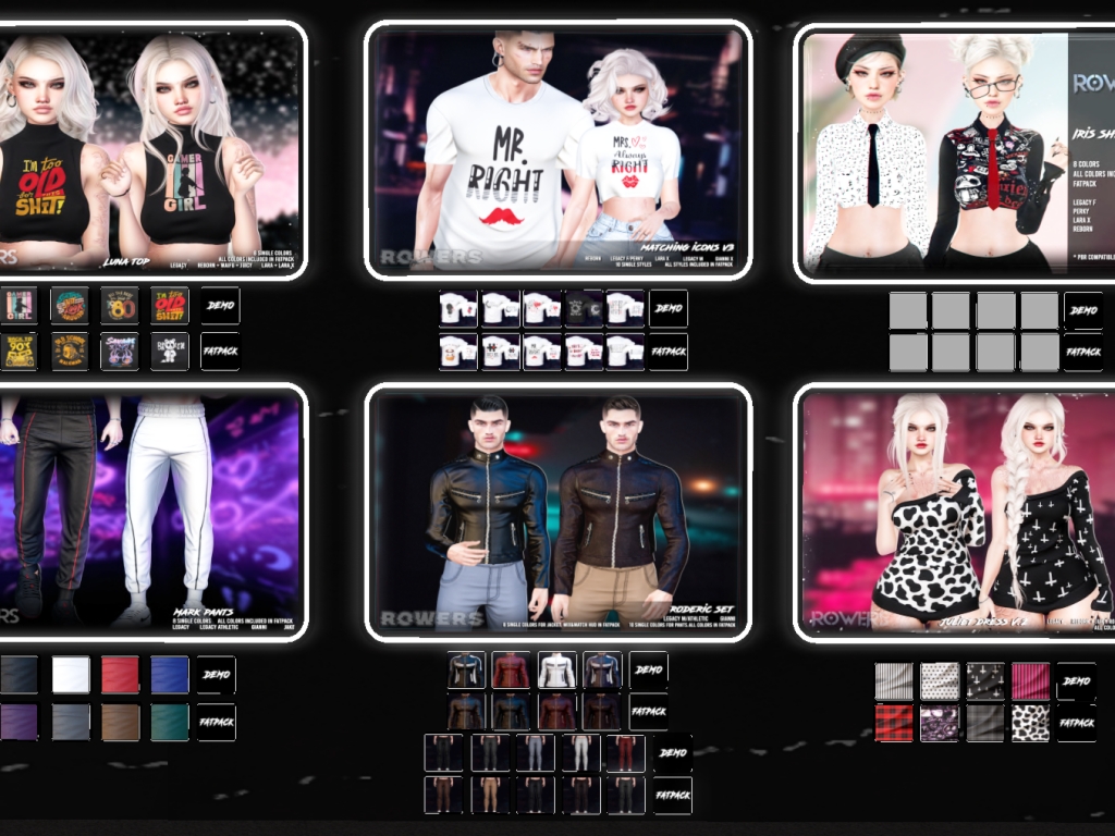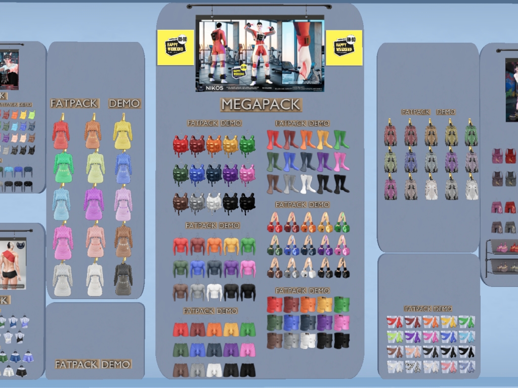 Featuring: Accessories, Animals/Pets/Companions, Animations/Poses/Props, Appliers/Cosmetics/Nails, Avatar Components, Avatar Enhancements, Builds, Clothing, Footwear, Hairs, Home and Garden, HUDs, Shapes, Skins, Tattoos, Vehicles