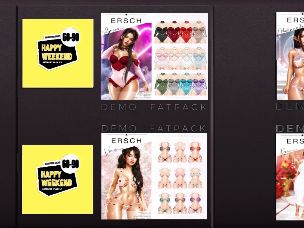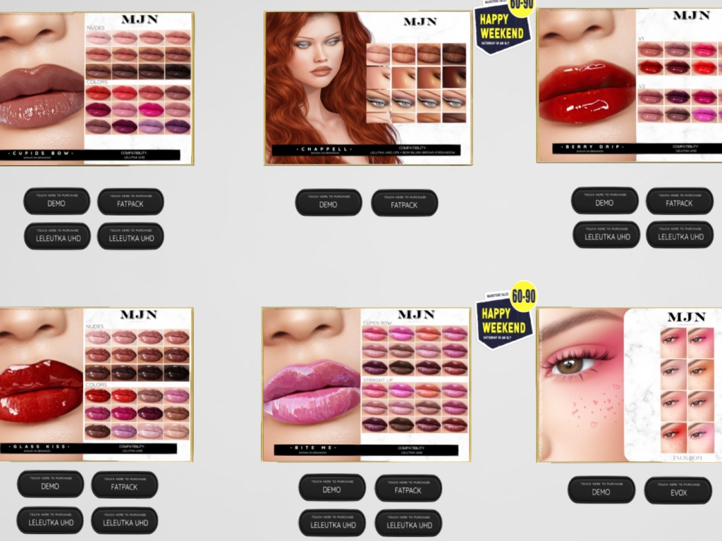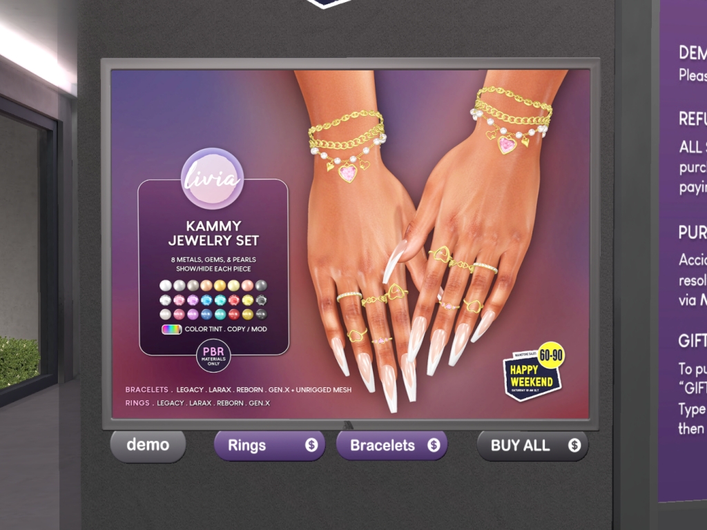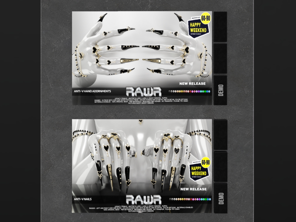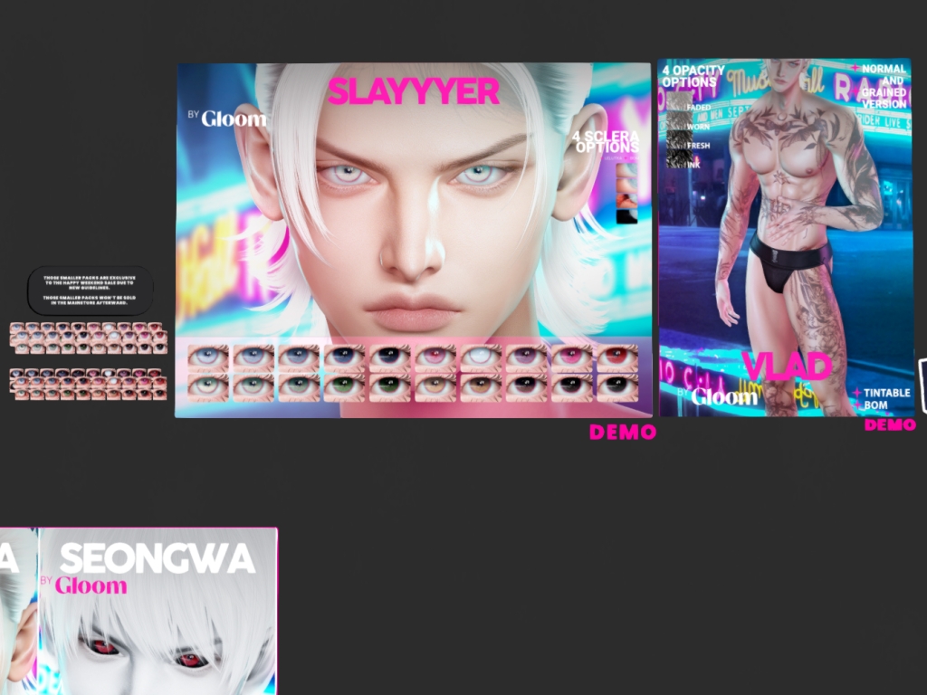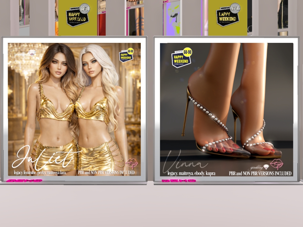 Featuring: Accessories, Animals/Pets/Companions, Animations/Poses/Props, Appliers/Cosmetics/Nails, Avatar Components, Avatar Enhancements, Builds, Clothing, Footwear, Hairs, Home and Garden, HUDs, Shapes, Skins, Tattoos, Vehicles