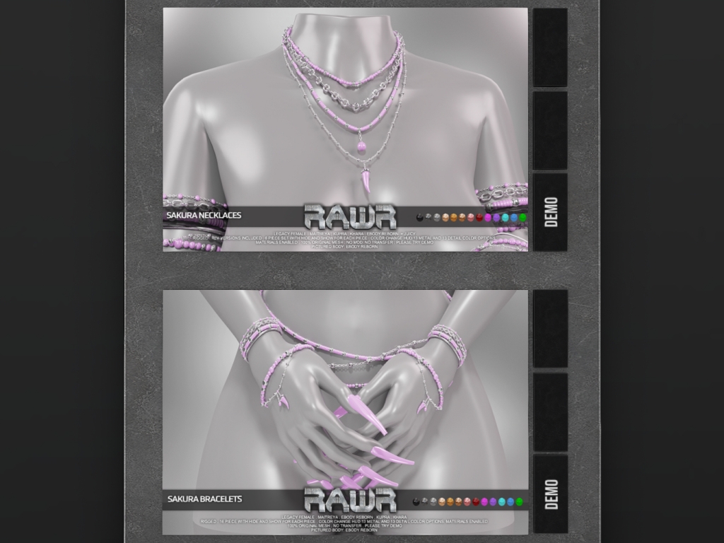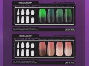 Featuring: Animals/Pets/Companions, Appliers/Cosmetics/Nails, Builds, Clothing, Footwear, Hairs, Home and Garden, Skins