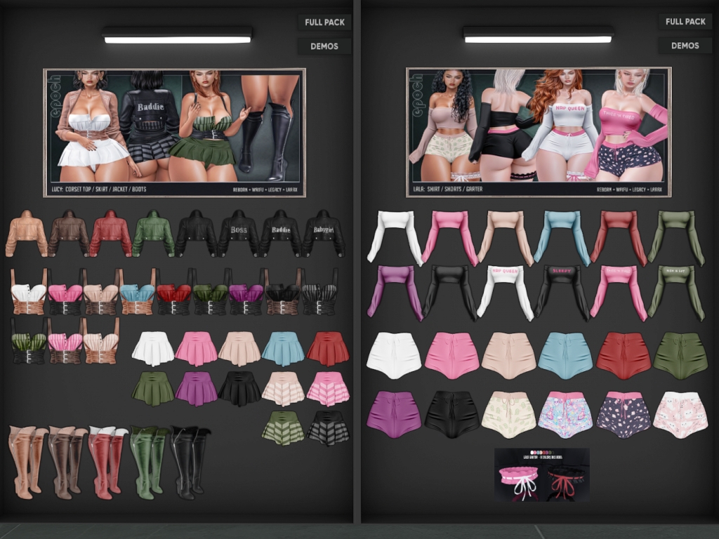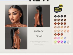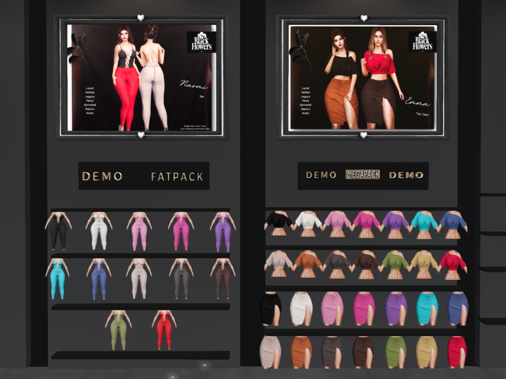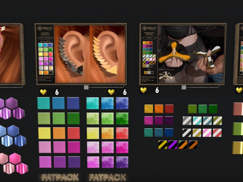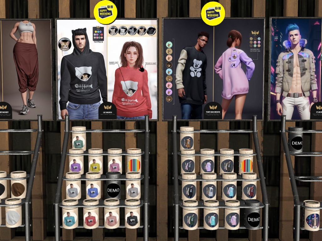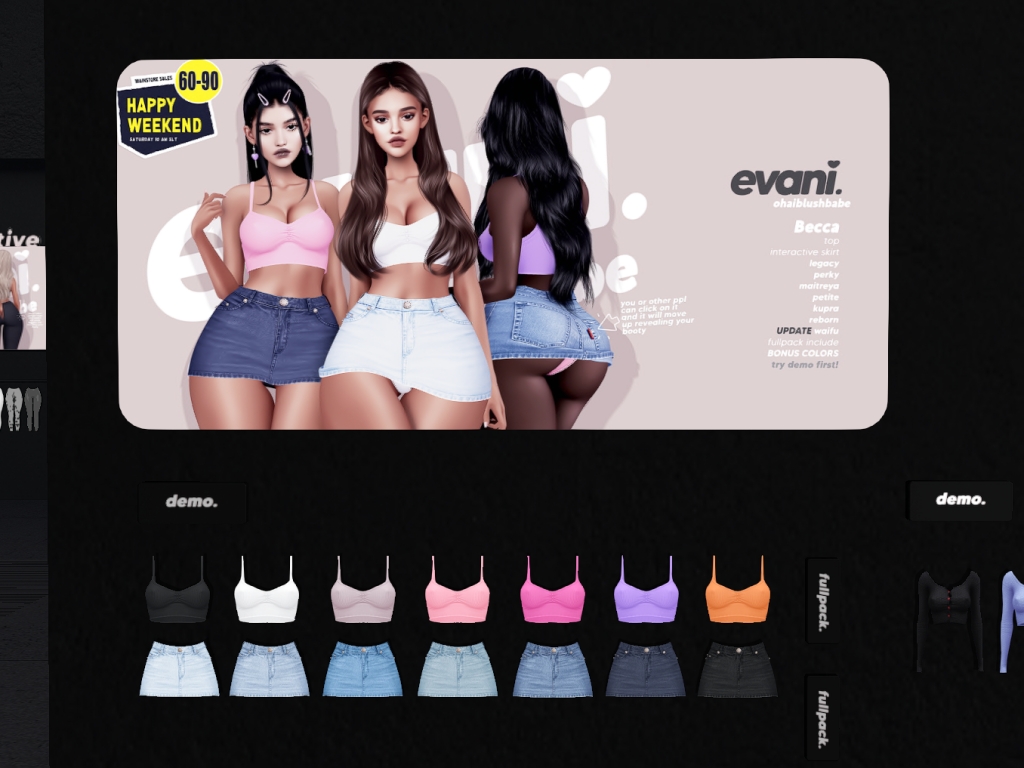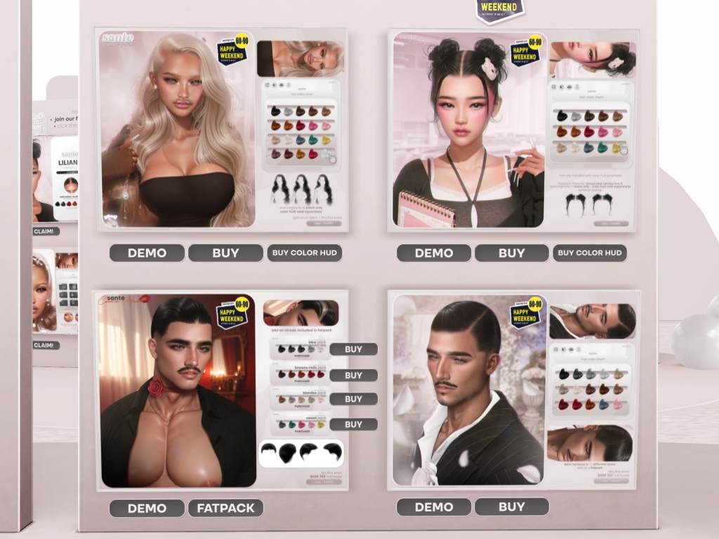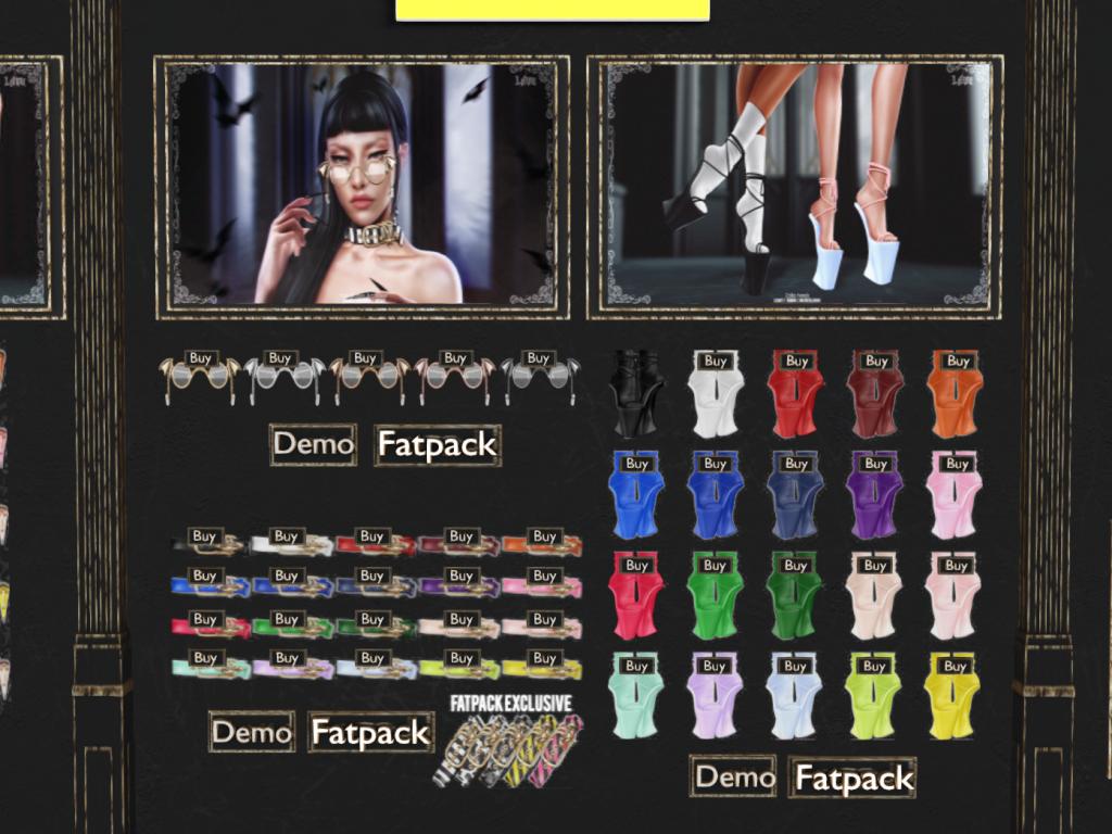 Featuring: Accessories, Animals/Pets/Companions, Animations/Poses/Props, Appliers/Cosmetics/Nails, Avatar Components, Avatar Enhancements, Builds, Clothing, Footwear, Hairs, Home and Garden, HUDs, Shapes, Skins, Tattoos, Vehicles