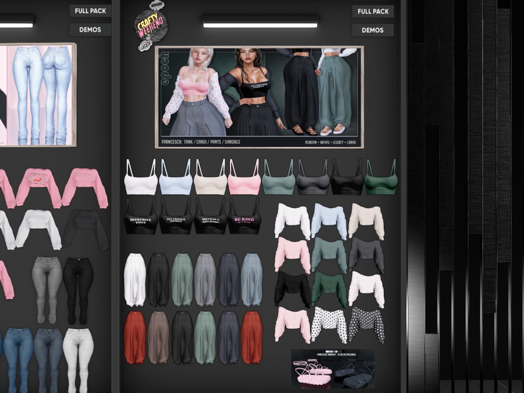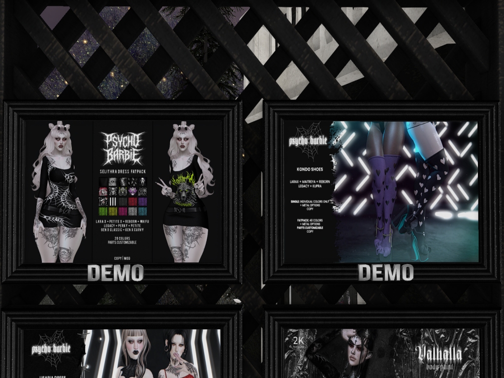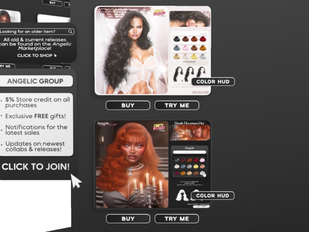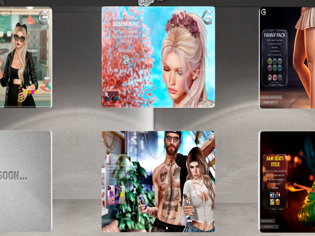 Featuring: Accessories, Animations/Poses/Props, Appliers/Cosmetics/Nails, Avatar Components, Avatar Enhancements, Builds, Clothing, Footwear, Hairs, Home and Garden, Skins, Tattoos, Vehicles