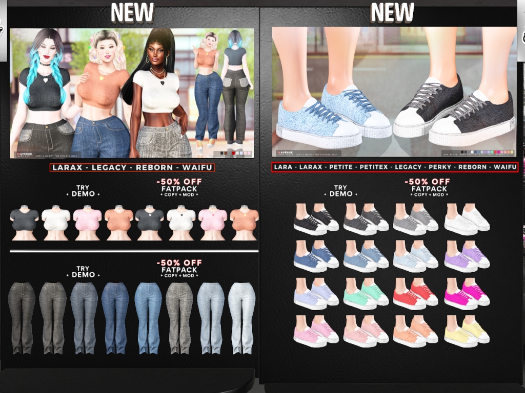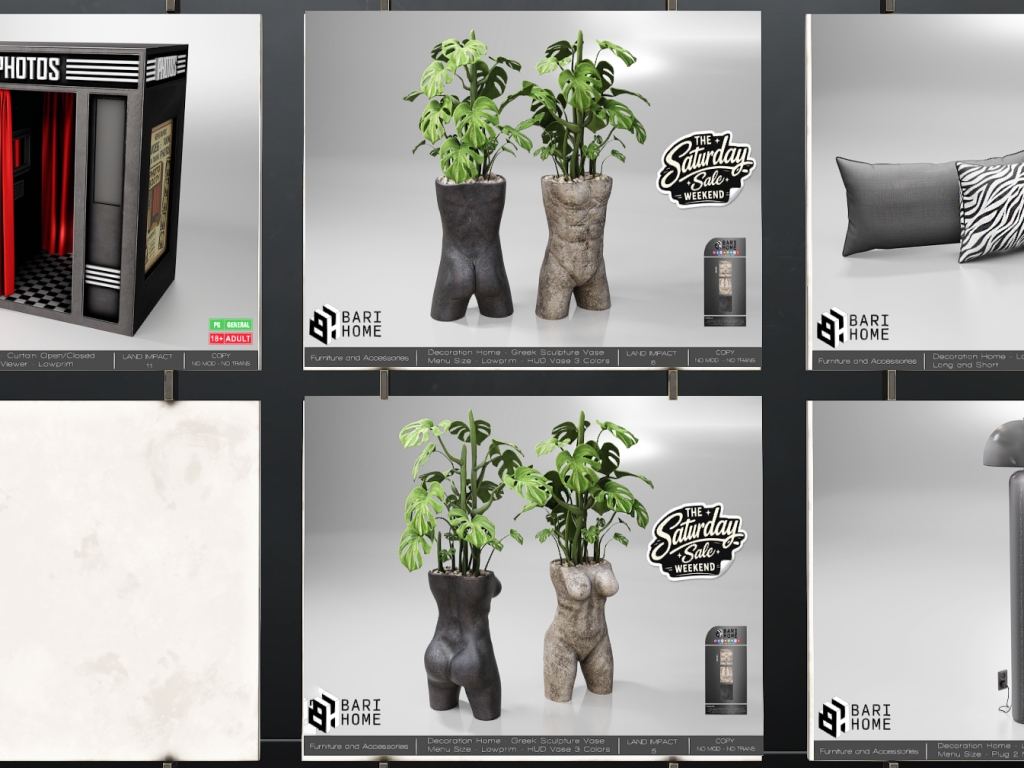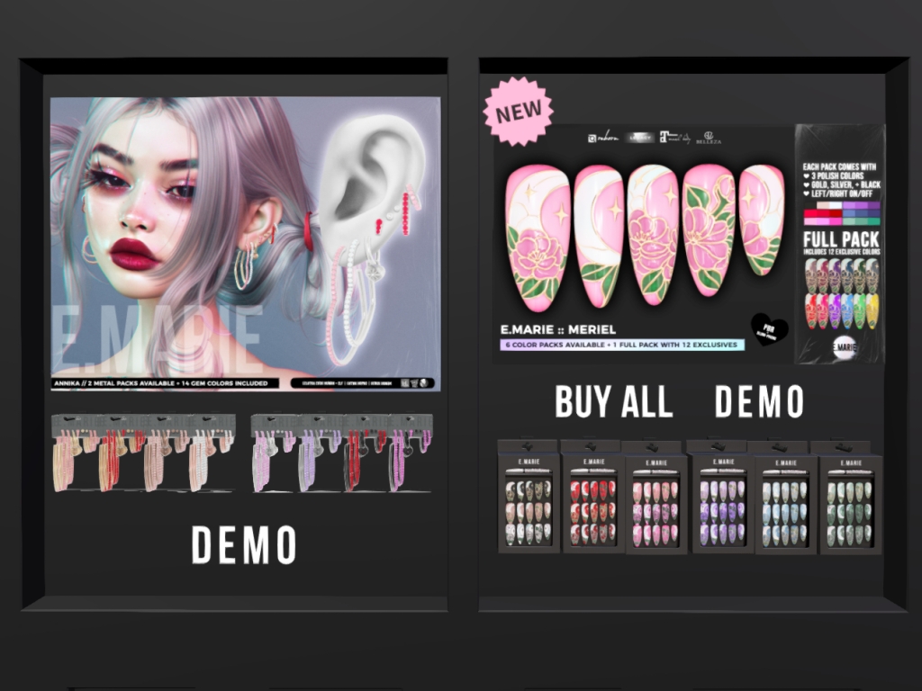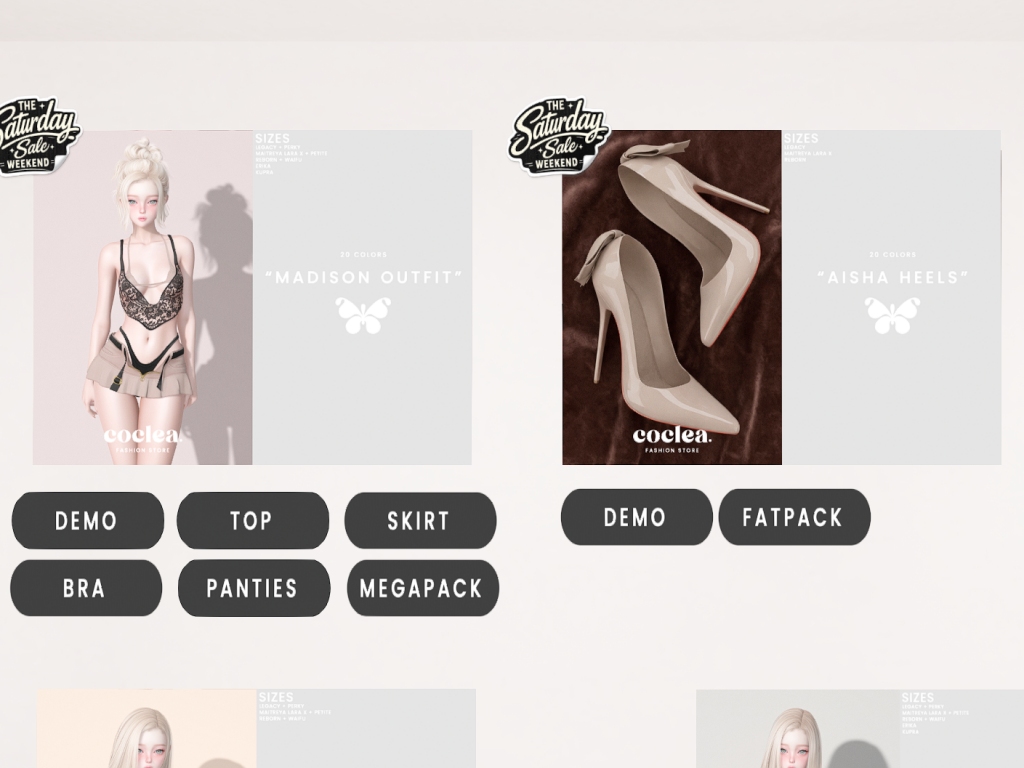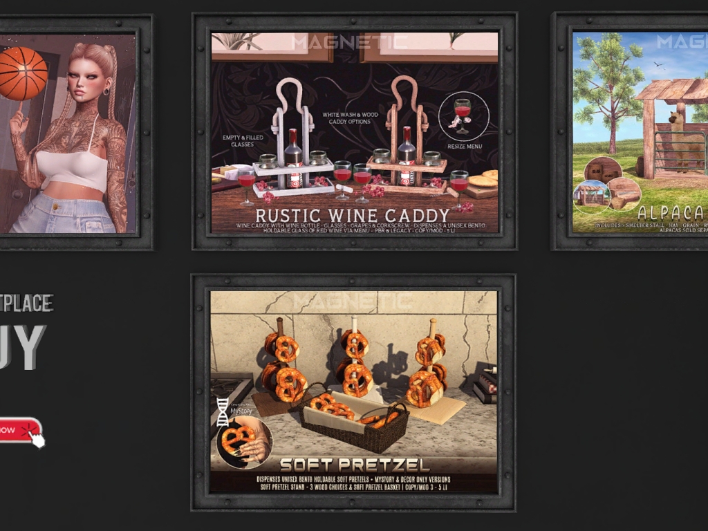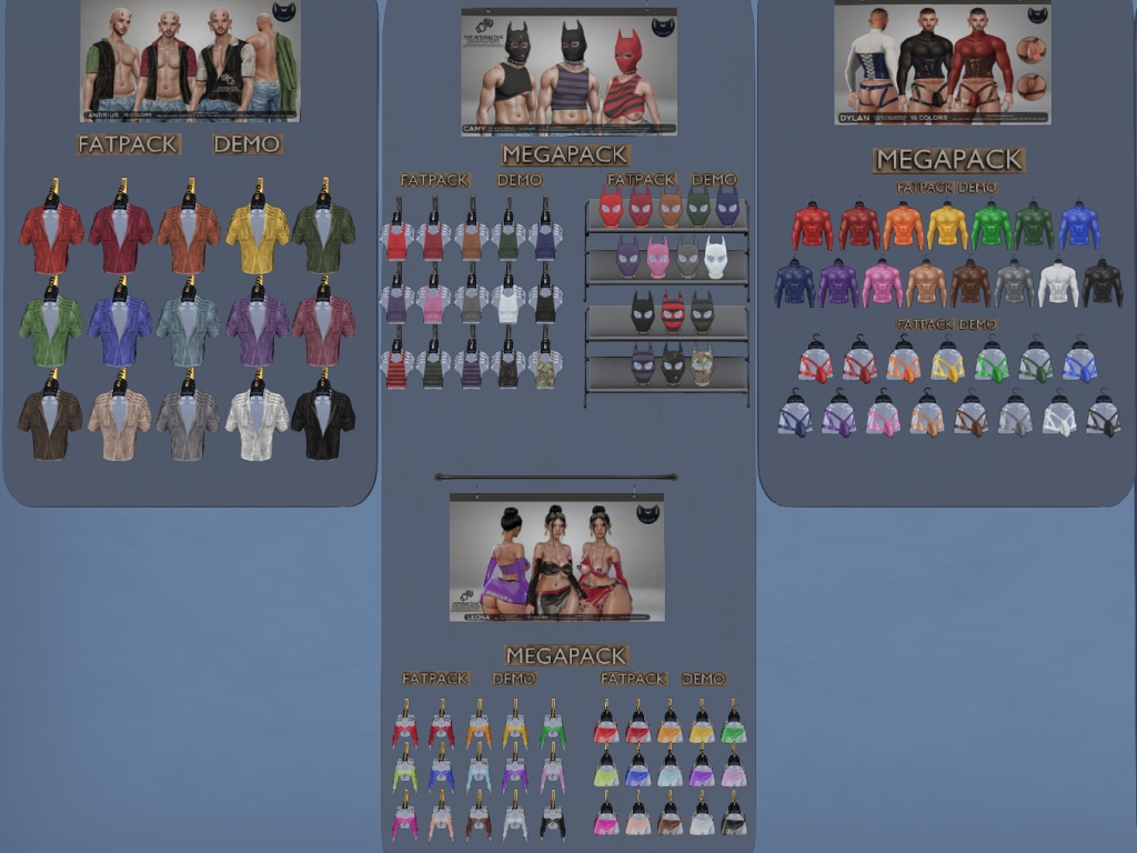 Featuring: Accessories, Animations/Poses/Props, Appliers/Cosmetics/Nails, Avatar Components, Avatar Enhancements, Builds, Clothing, Hairs, Home and Garden, Skins, Tattoos, Vehicles