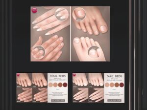 Featuring: Accessories, Animations/Poses/Props, Appliers/Cosmetics/Nails, Avatar Enhancements, Builds, Clothing, Footwear, Hairs, Home and Garden, Shapes, Skins