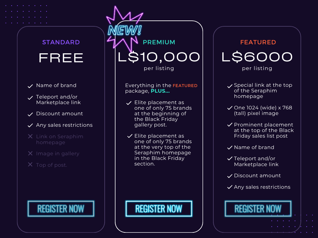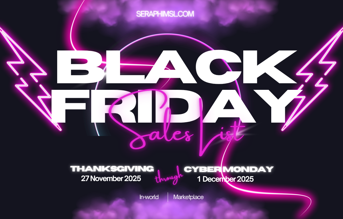 If you wish to participate in the featured Black Friday Sales List, please make all payments to SeraphimSL Resident, ONLY!
